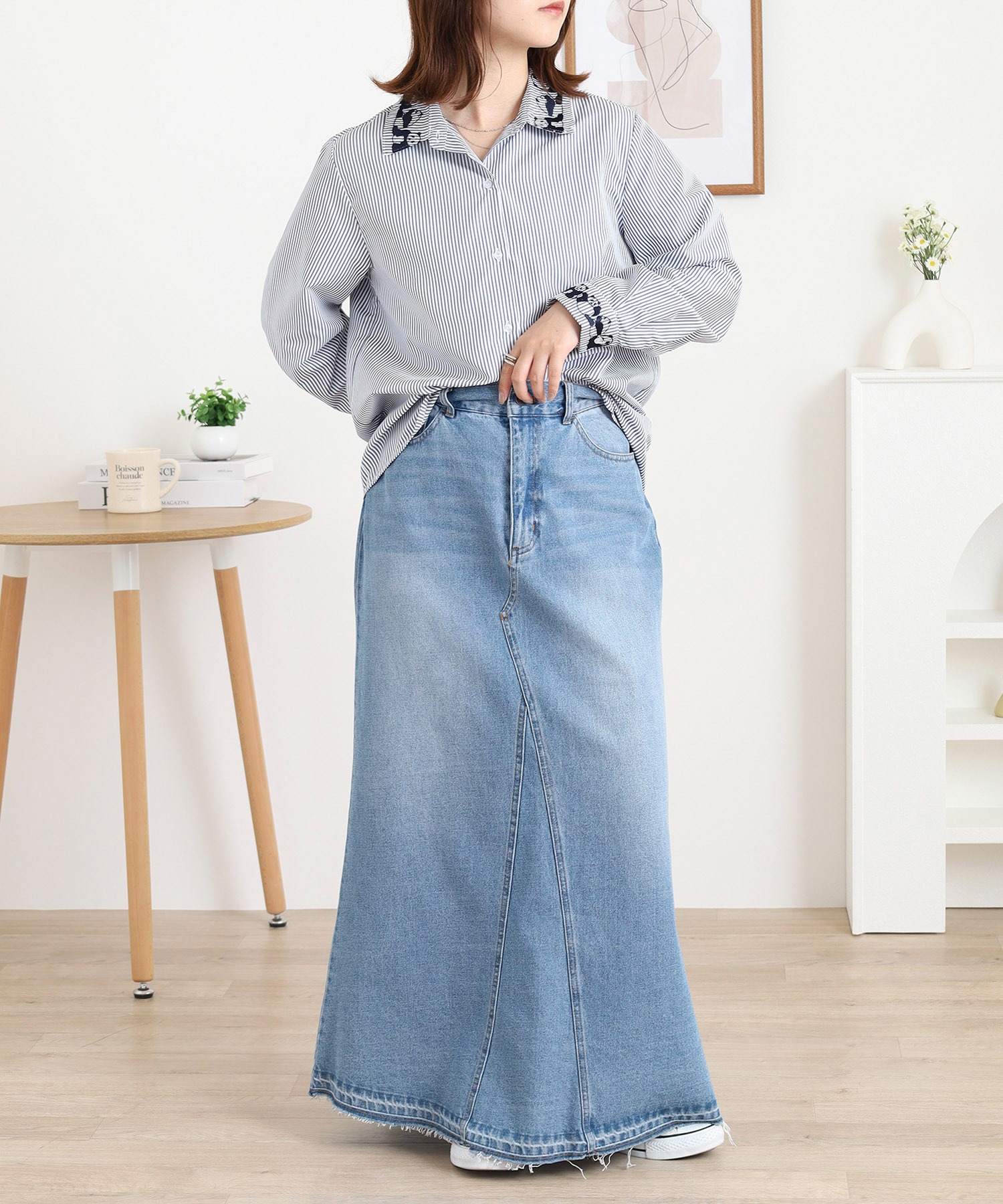 シンプルなスリットスカート、ペンシルスカート、マーメイドスカートなど合わせてキレイ目フェミニンスタイルにも◎