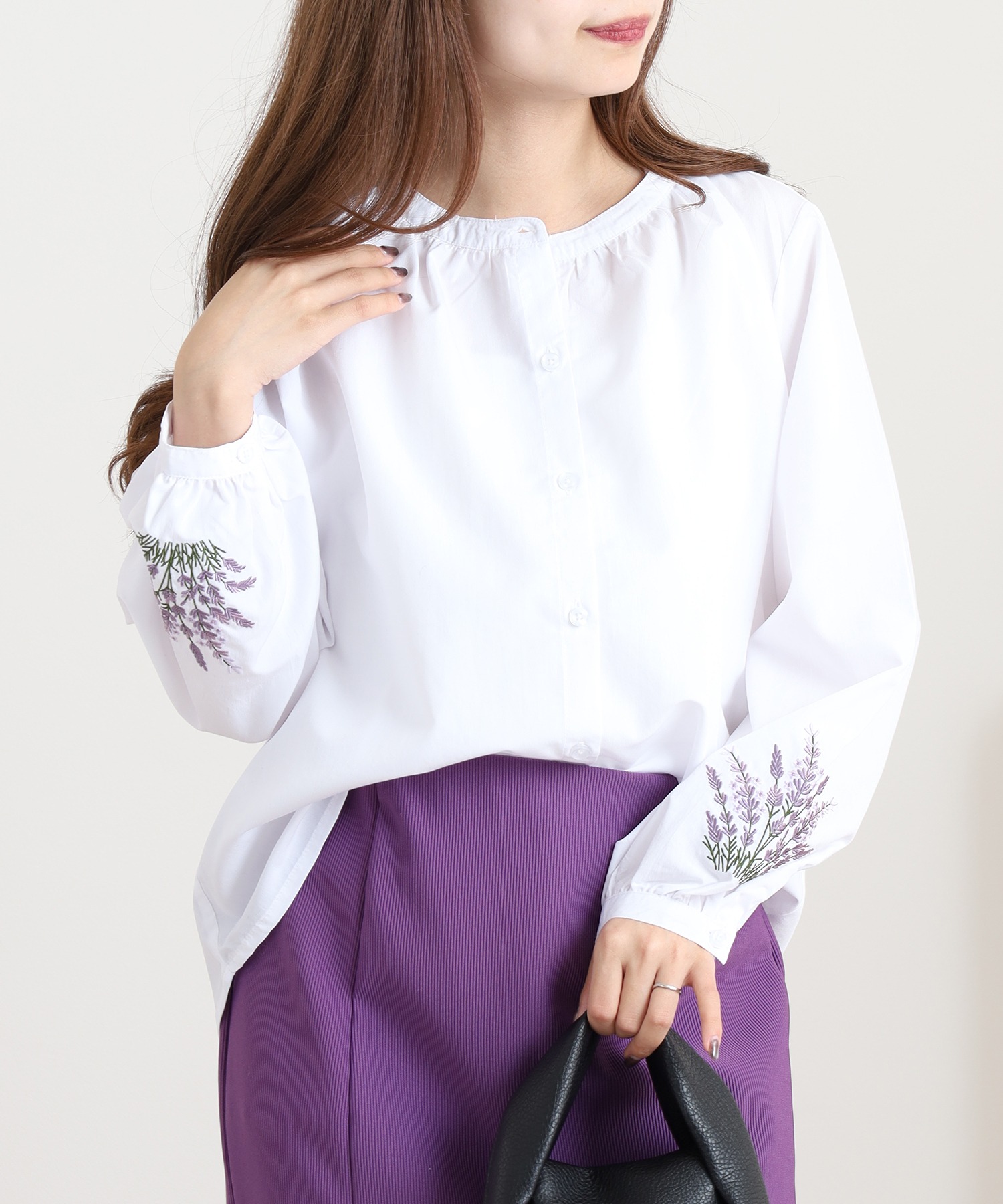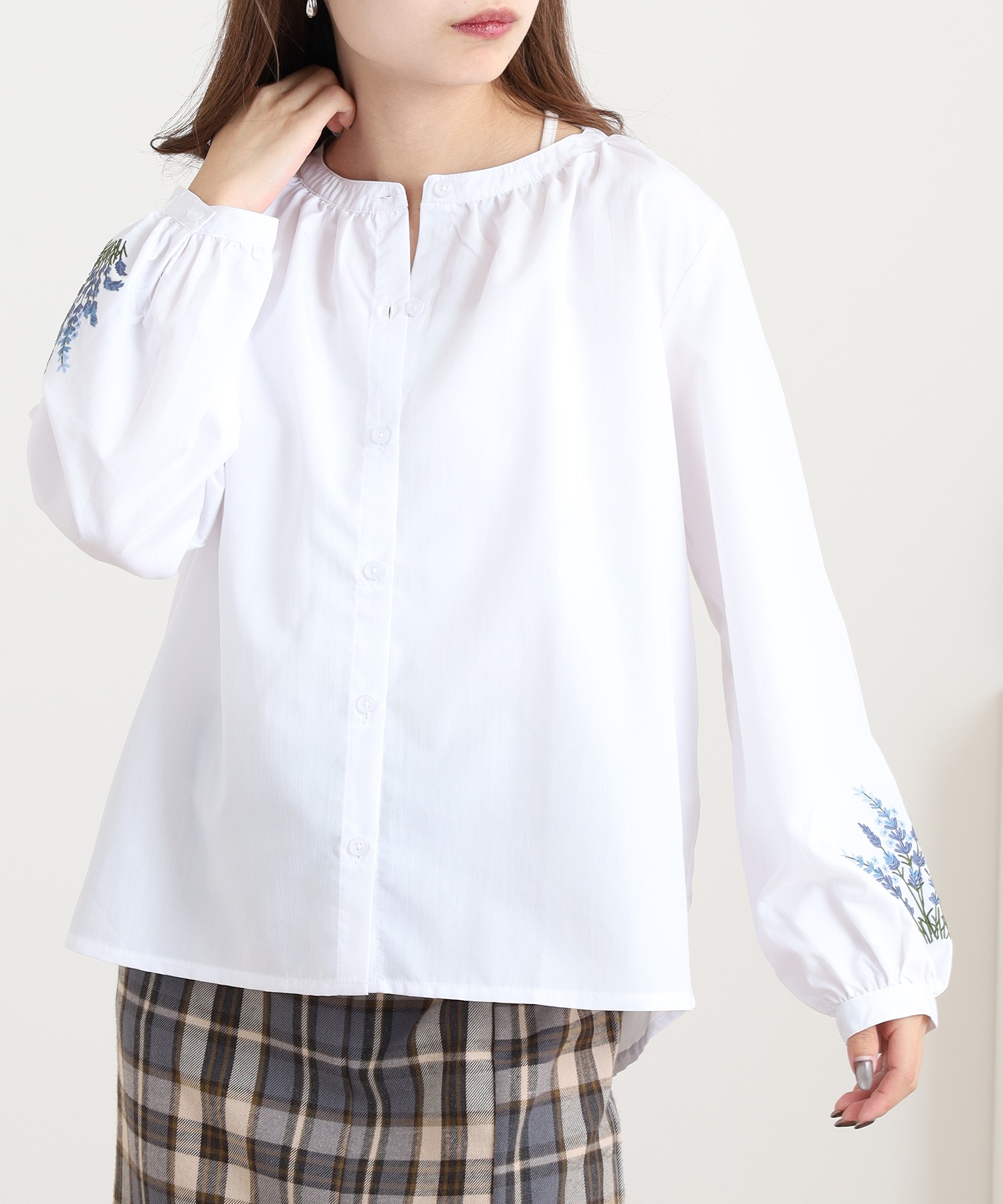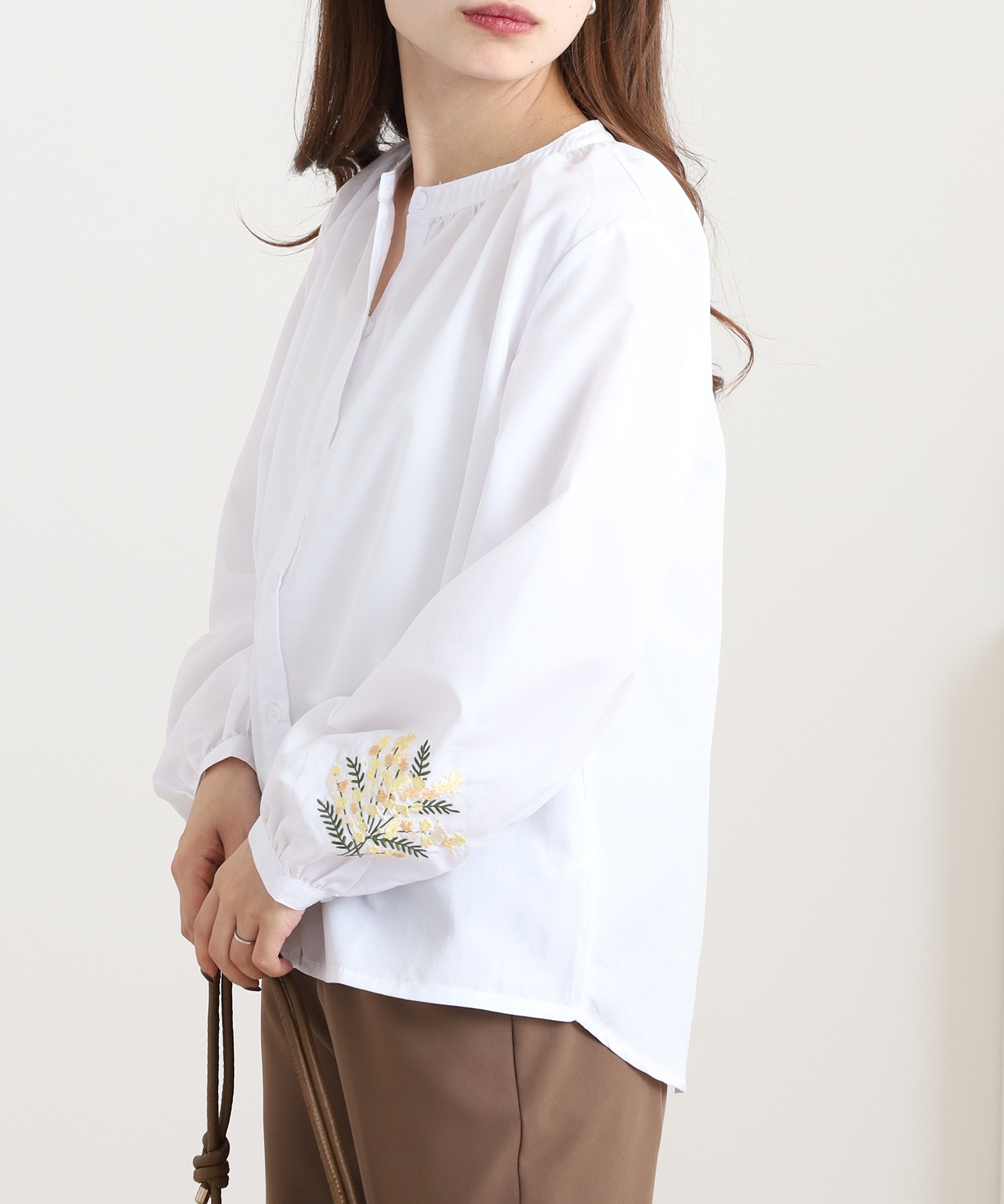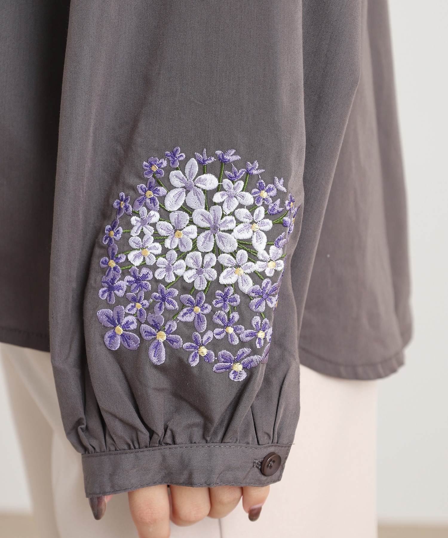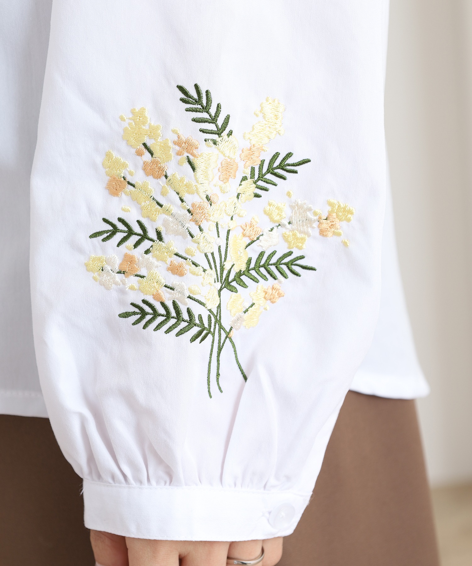 すっきりとした身頃に、袖の刺繍が映えるフェミニンなシルエット。