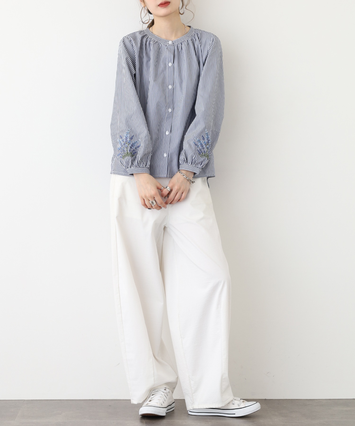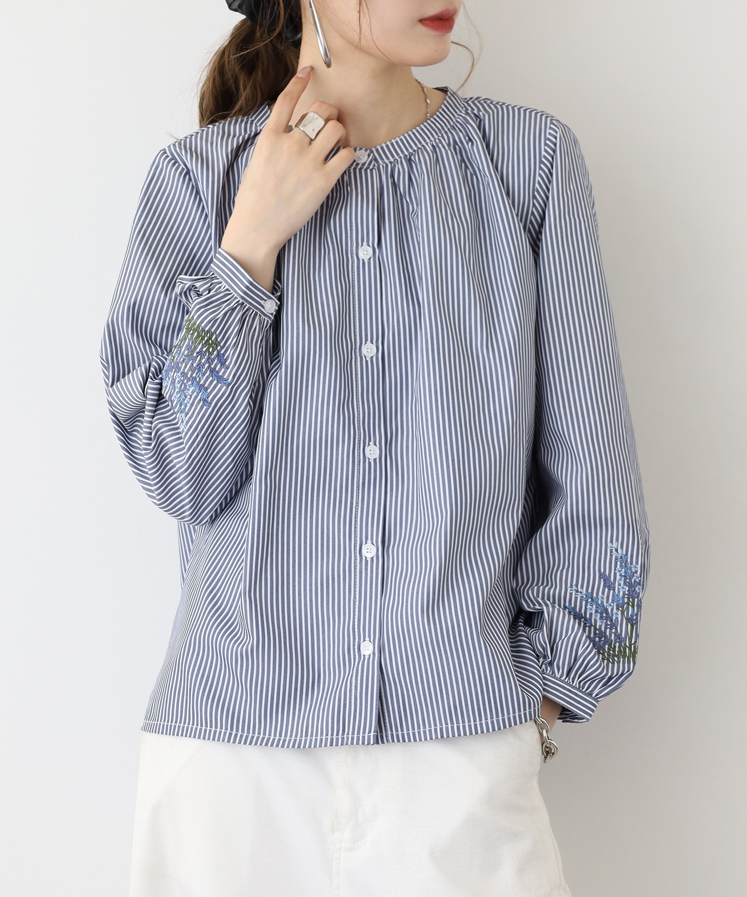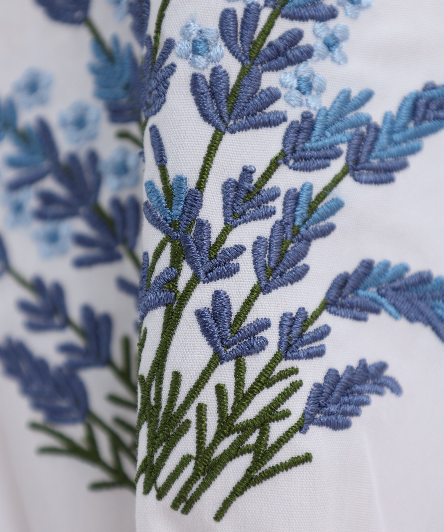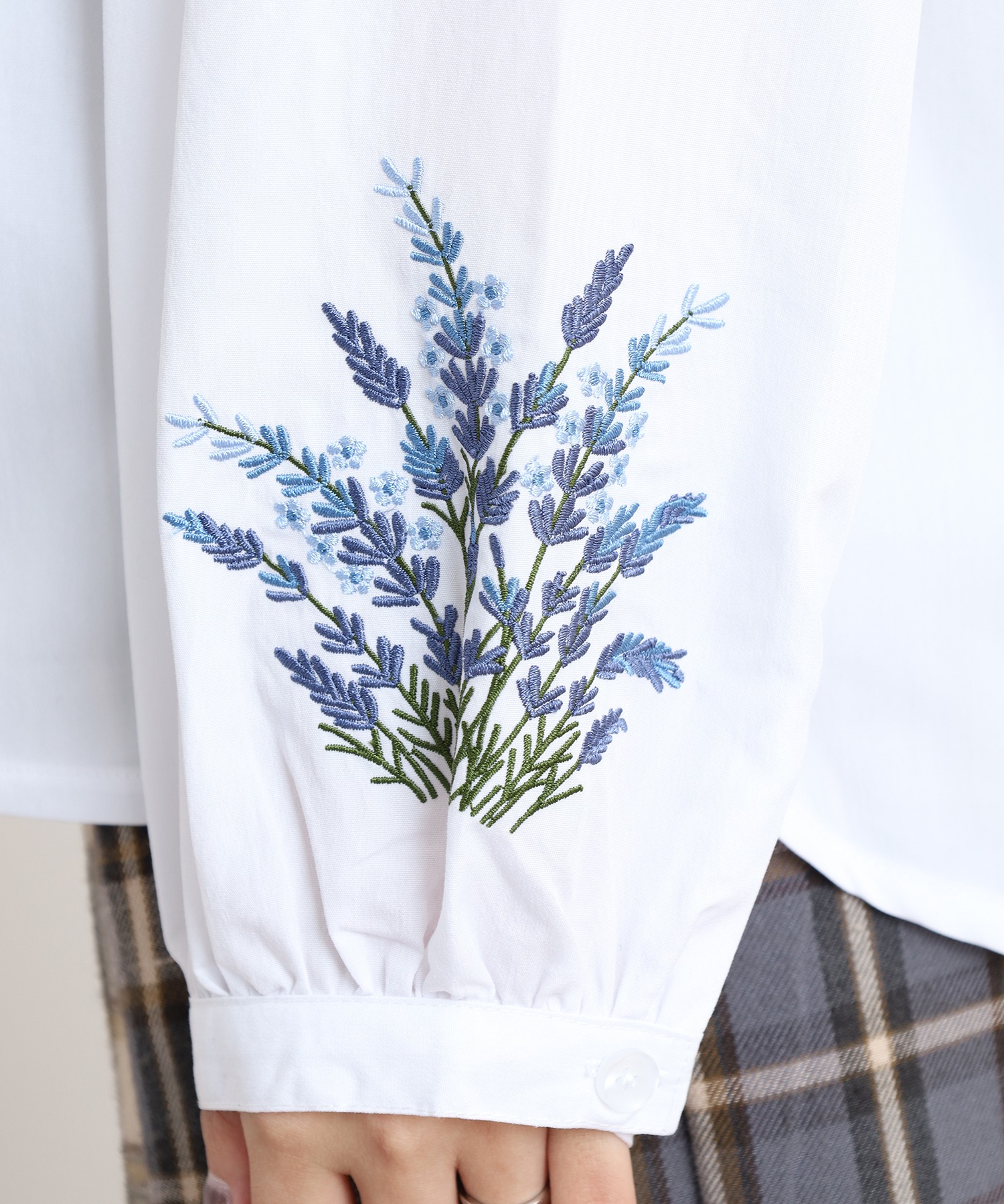 すっきりとした身頃に、袖の刺繍が映えるフェミニンなシルエット。