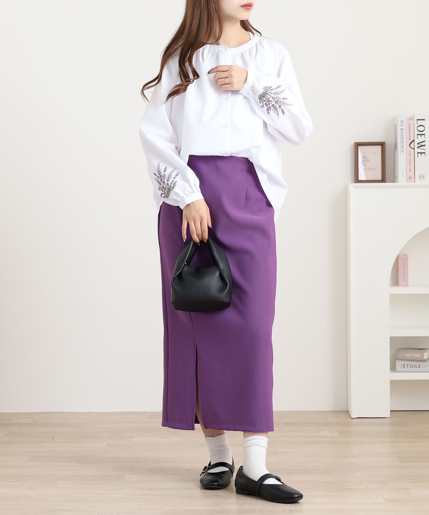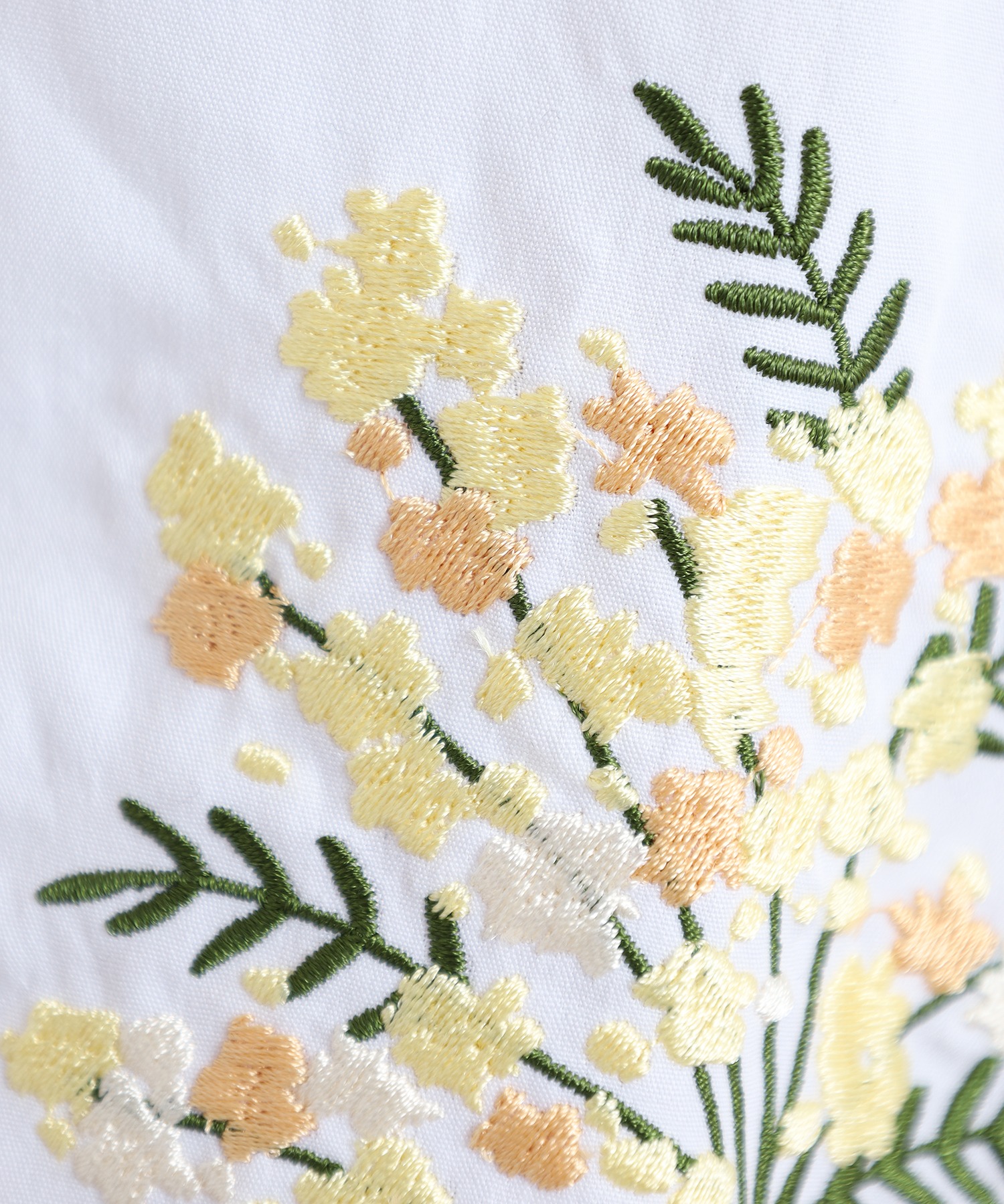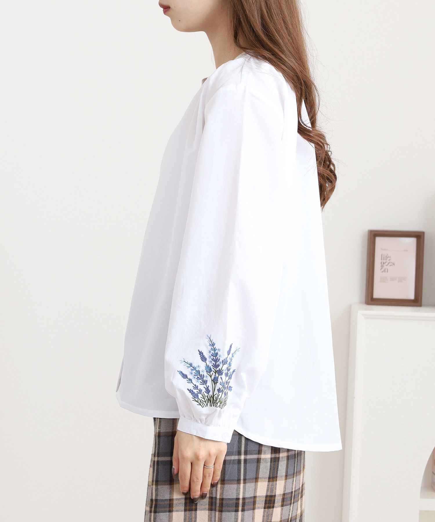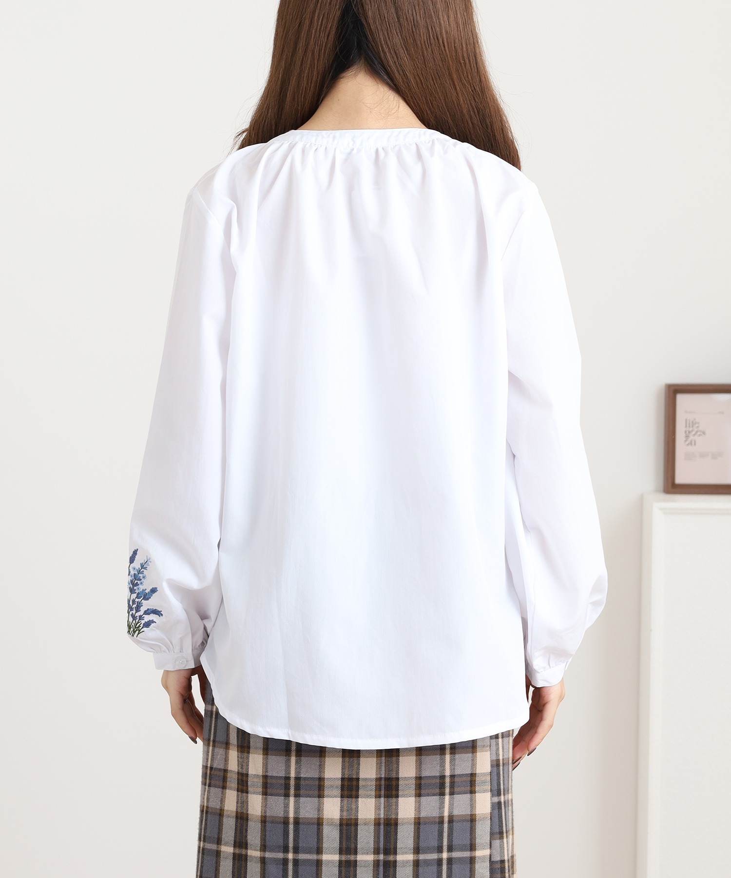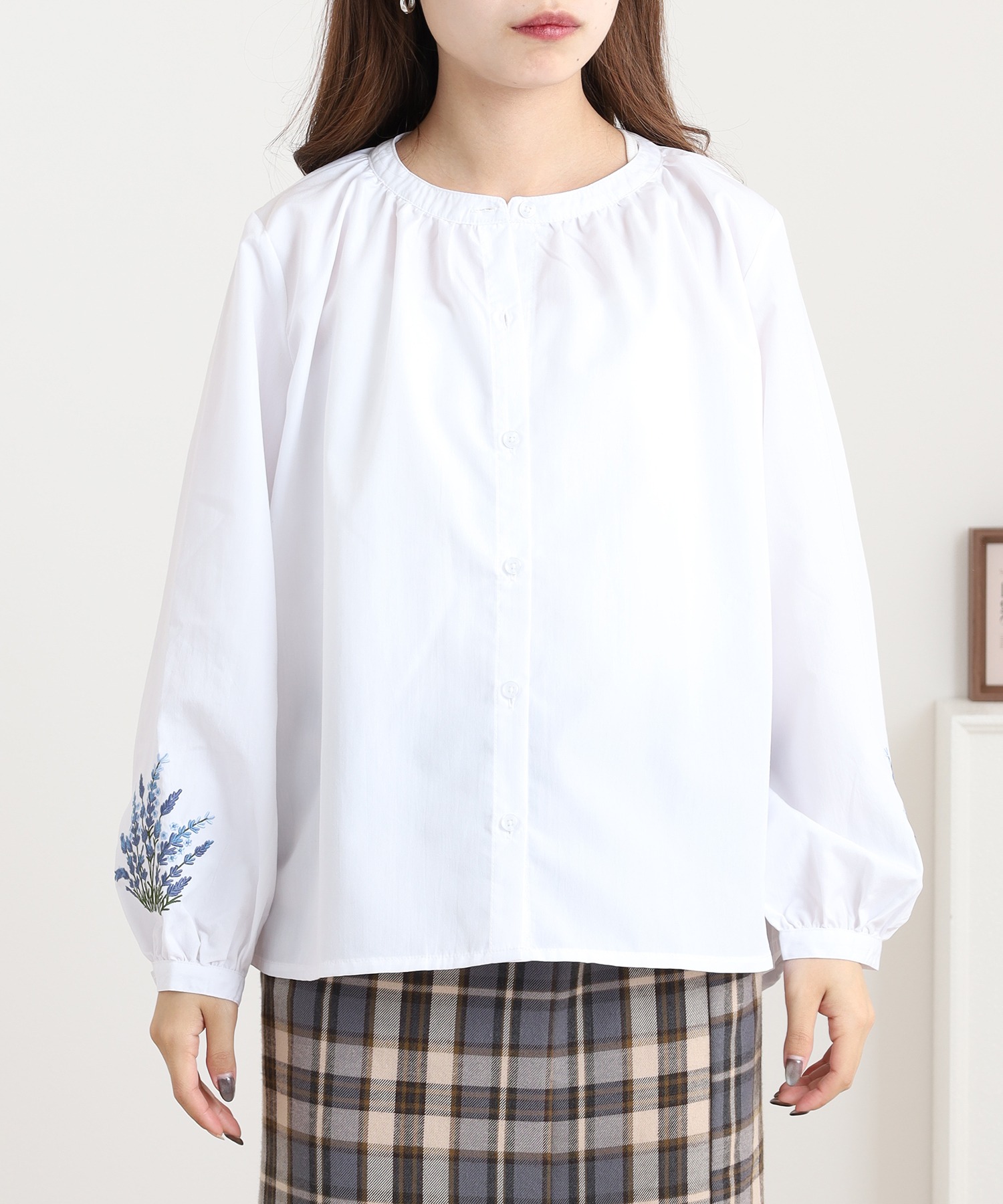 すっきりとした身頃に、袖の刺繍が映えるフェミニンなシルエット。