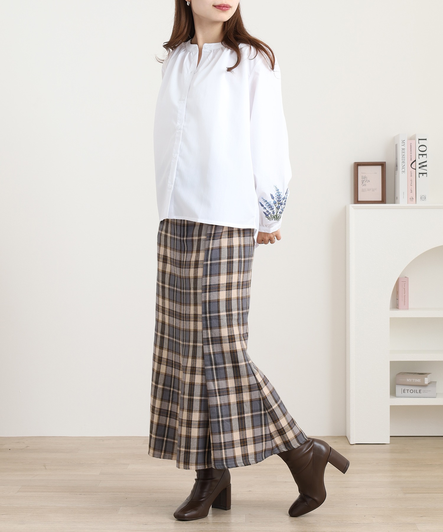花刺繍が映えるブラウスは、フレアスカート×ショートブーツでクラシカルな秋冬スタイルに。