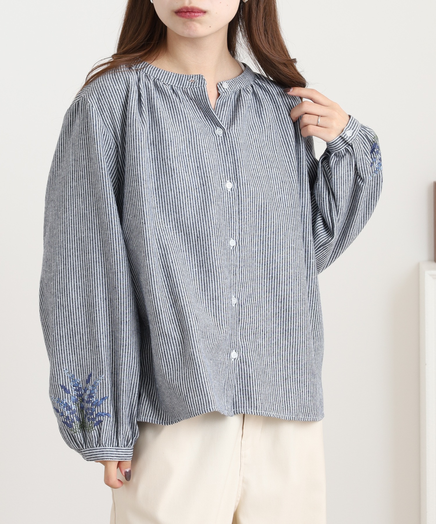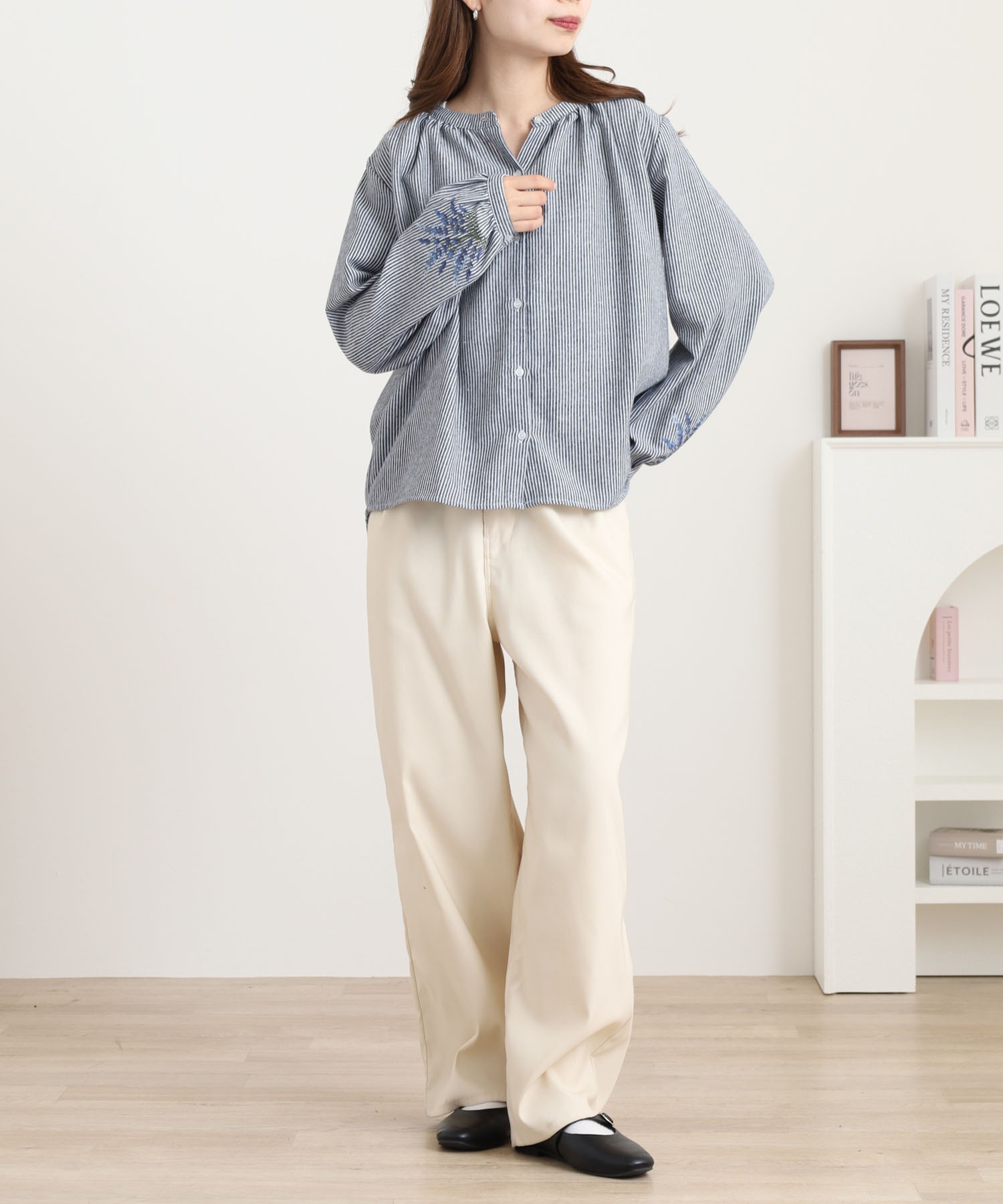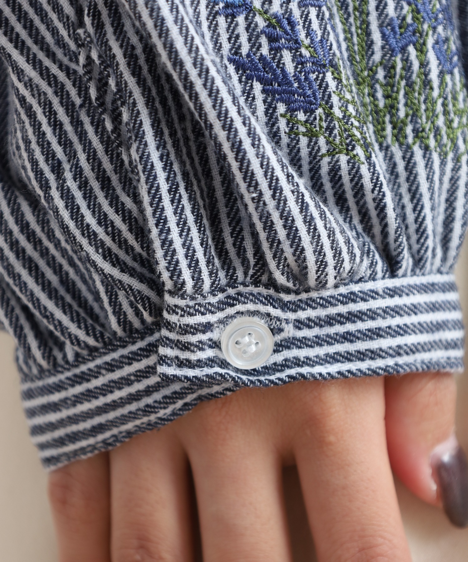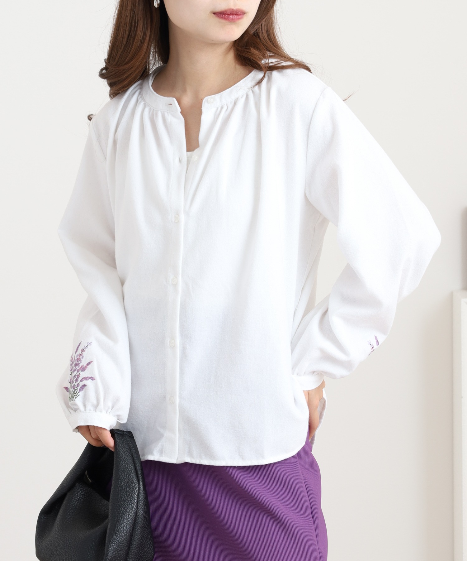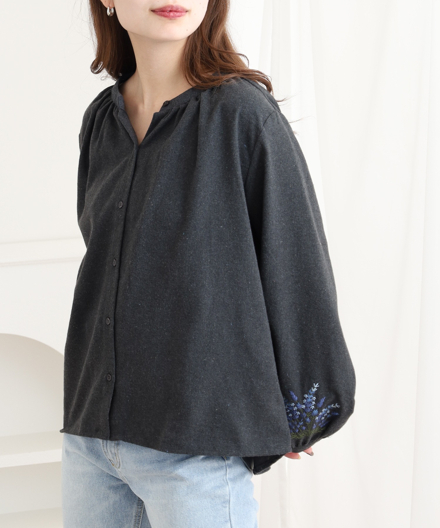 すっきりとした身頃に、袖の刺繍が映えるフェミニンなシルエット。