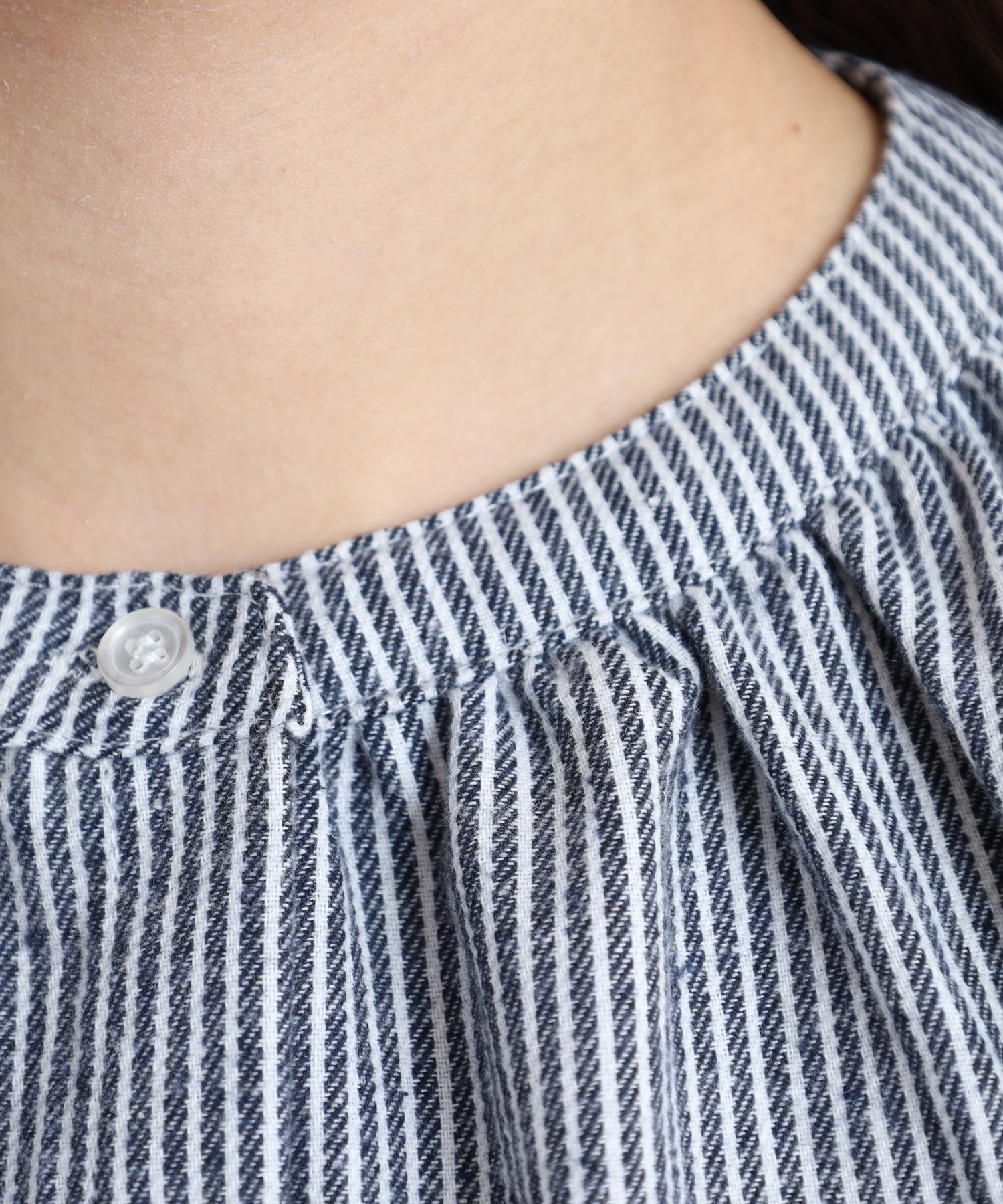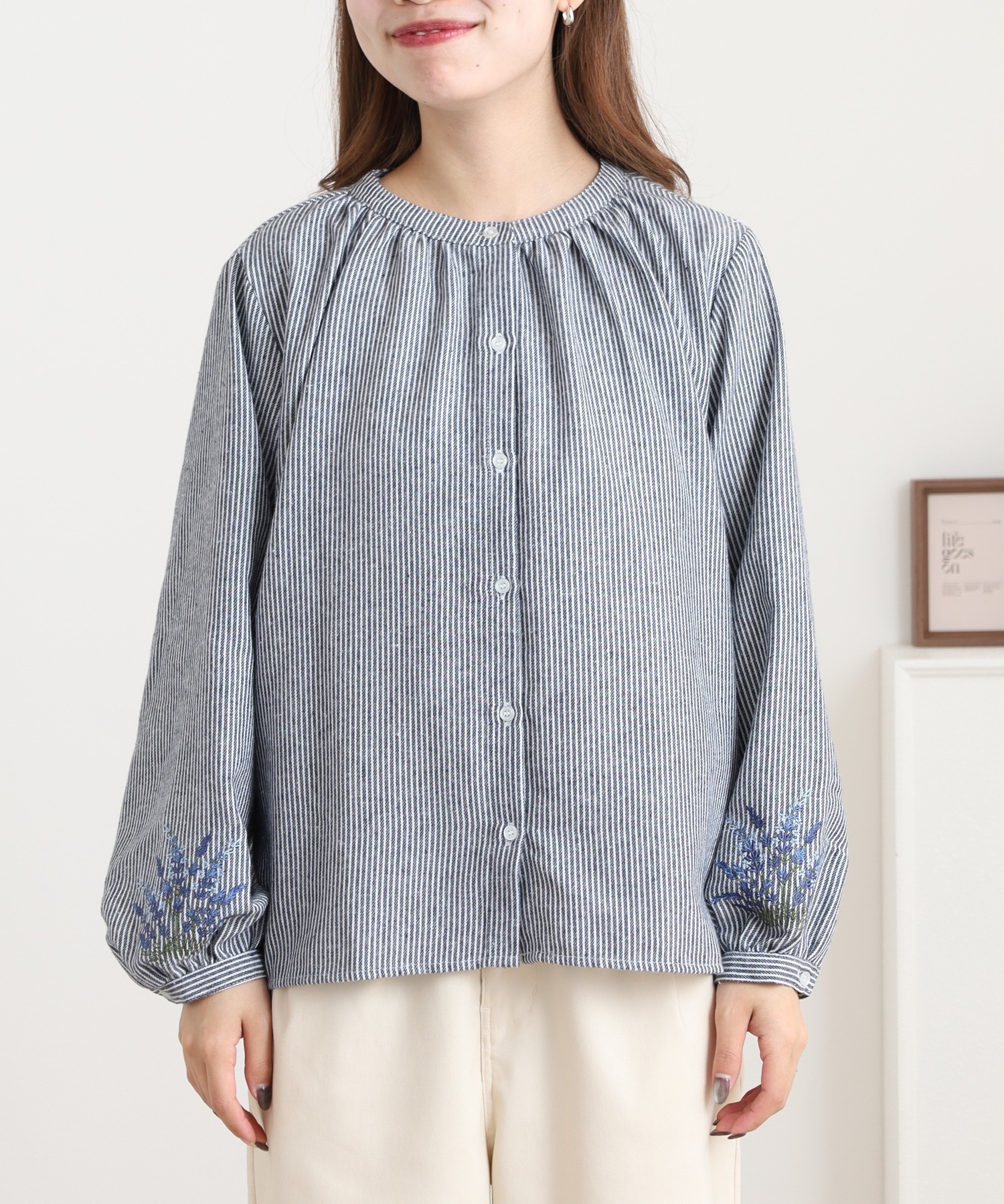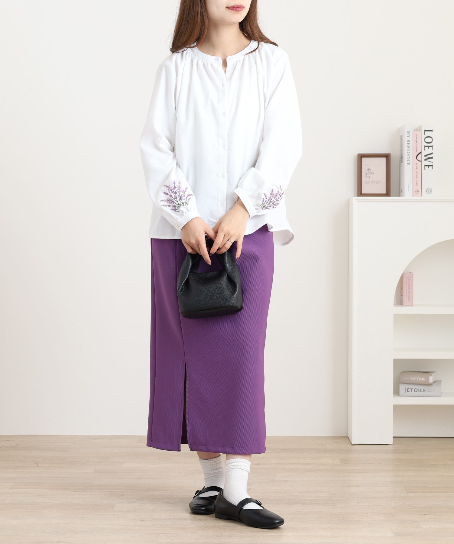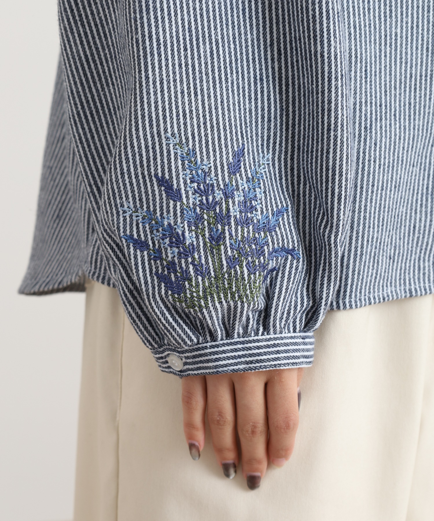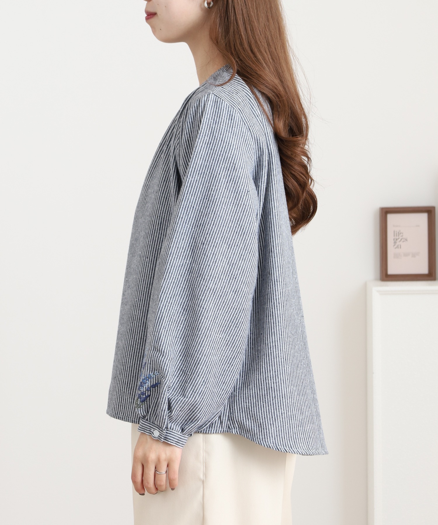 すっきりとした身頃に、袖の刺繍が映えるフェミニンなシルエット。